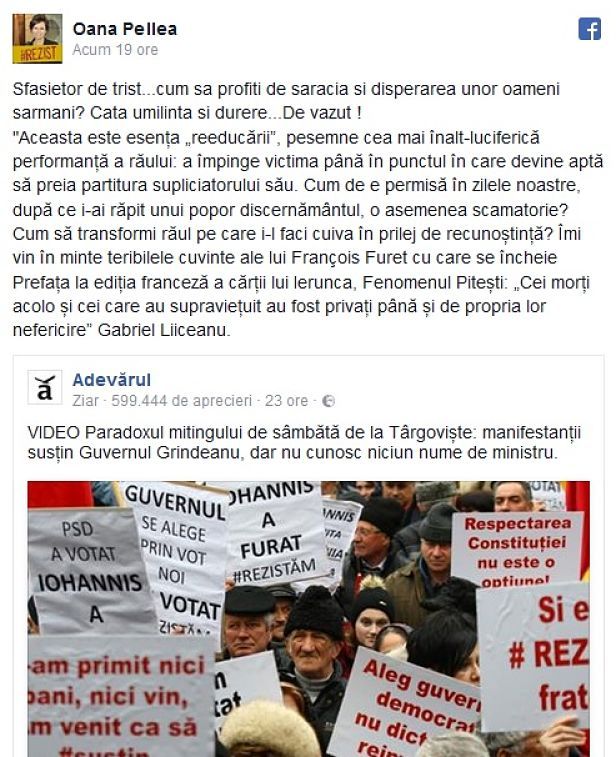 Ea a postat pe pagina sa de Facebook un reportaj realizat de jurnalistii de la Adevarul, intitulat „PSD, operatiunea de umilire a propriului electorat”, constatand ca este „sfasietor de trist” ce au facut liderii partidului de guvernmant.